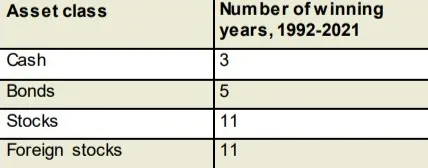 The following table shows how many times during the past 30 years each asset class has come out on top in terms of performance. It helps illustrate why diversifying among asset classes can be important. Bear in mind, however, that this table does not reveal the ups and downs experienced along the way. Although stocks in general, and foreign stocks in particular, have come out on top in terms of winning years, the amount of volatility they experience is typically greater, and sometimes far greater, than that of cash and bonds.