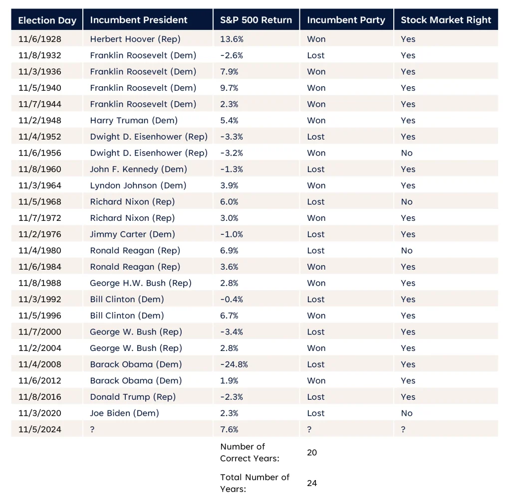 It’s hard to mention policy and the election without referencing one of the stock market’s more popular and accurate election predictors. Historically, the stock market has been a surprisingly accurate and unbiased election forecaster. Since 1928, if the S&P 500 was positive in the three months leading up to an election, the incumbent party remained in control of the White House 80% of the time (12 of 15 elections). Conversely, a declining market in the same period usually signaled a loss for the incumbent —occurring in eight of the last nine elections.