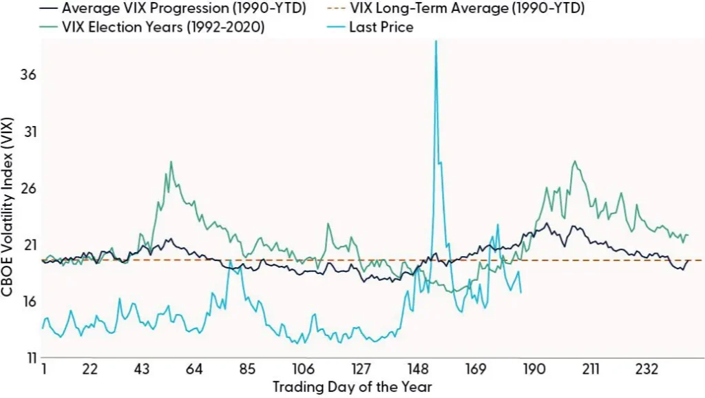 Stocks tend to be more volatile during election years, particularly within the three-month window before Election Day, as the accompanying chart illustrates. The CBOE Volatility Index (VIX) measure of implied market volatility (based on prices for index options) typically rises at this time of year, but the increase in volatility is more pronounced during election years.