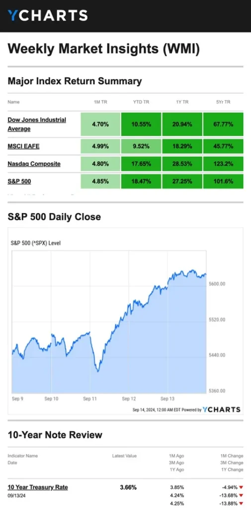 Source: YCharts.com, September 14, 2024. Weekly performance is measured from Monday, September 9, to Friday, September 13. TR = total return for the index, which includes any dividends as well as any other cash distributions during the period. Treasury note yield is expressed in basis points.